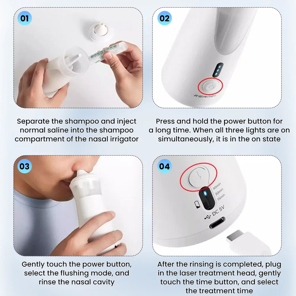 KN-3112L is a Medical Grade 2 in 1 Nasal irrigator & Rhinitis Treatment 650nm Red Light Nasal Laser Physical Therapy irrigator Apparatus Sinusitis Cure Machine Allergic Rhinitis Treatment Device.