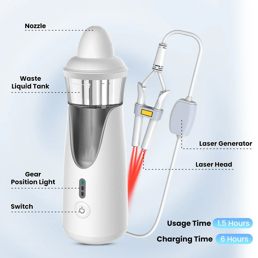 1. Combines water and light therapy in one device, featuring spray flushing and 650nm laser for anti-inflammatory effects.