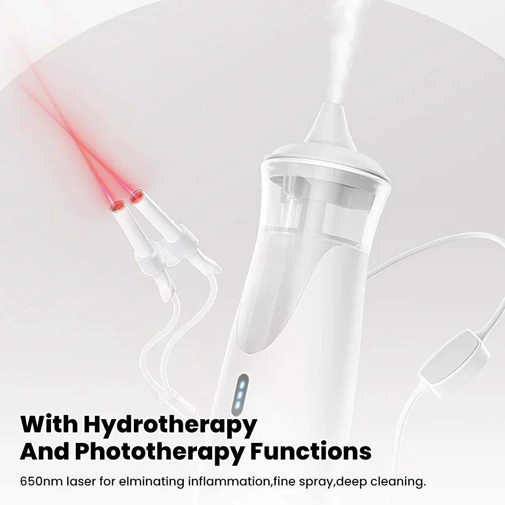 Rhinitis treatment instrument combines water and light therapy in one device, featuring spray flushing and 650nm laser for anti-inflammatory effects.