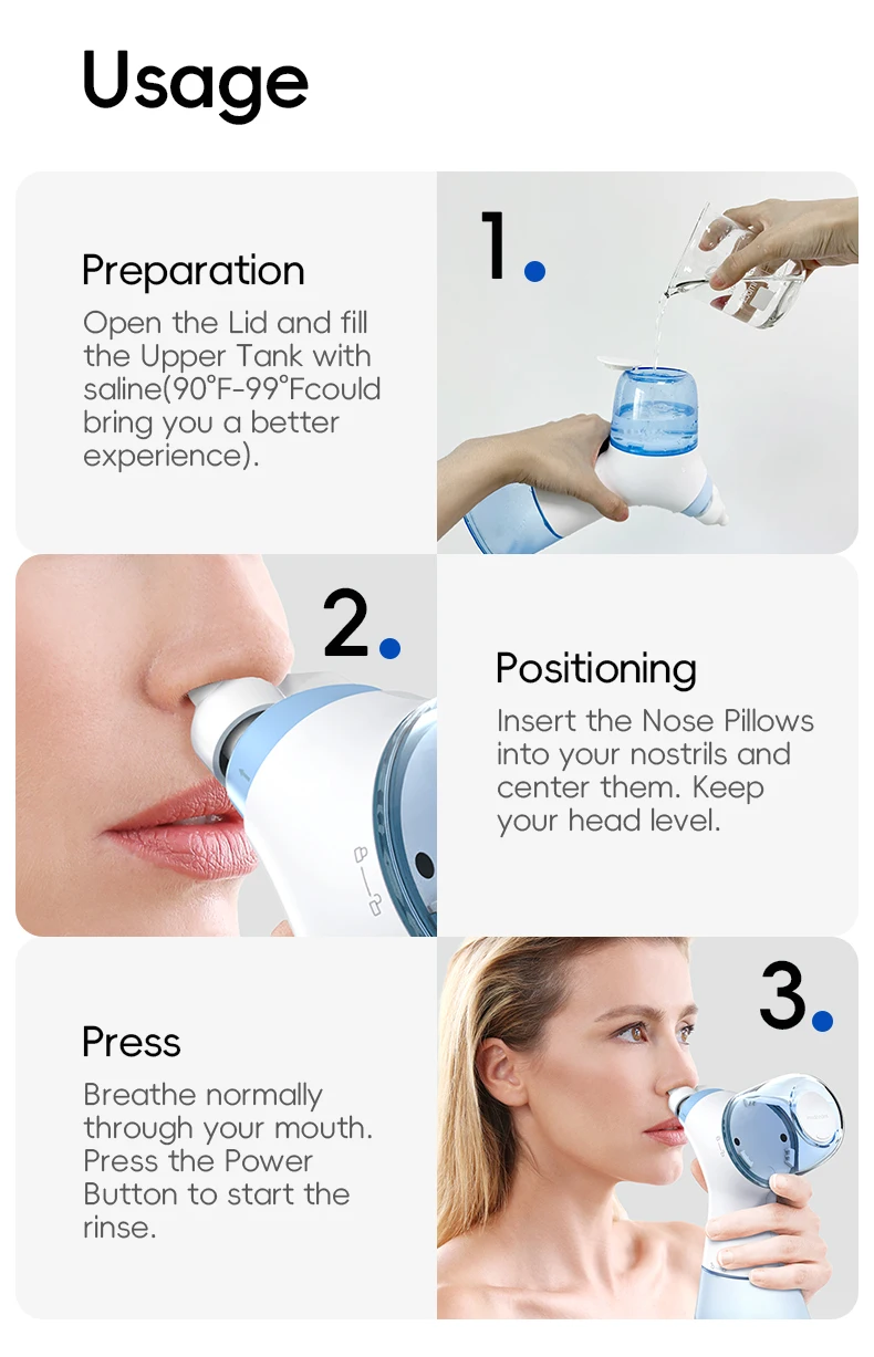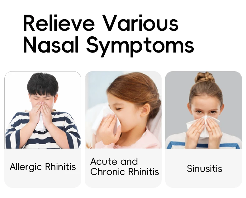 4.Flush saline into deep areas in the nose to remove nasal discharge and airborne particles and relieve congestion and inflammation.