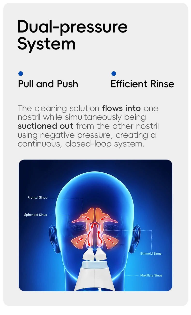 Dual nozzle design, suction and irrigation. Scientific pressure design to reduce pressure on nasal cavity, eyes and ears.