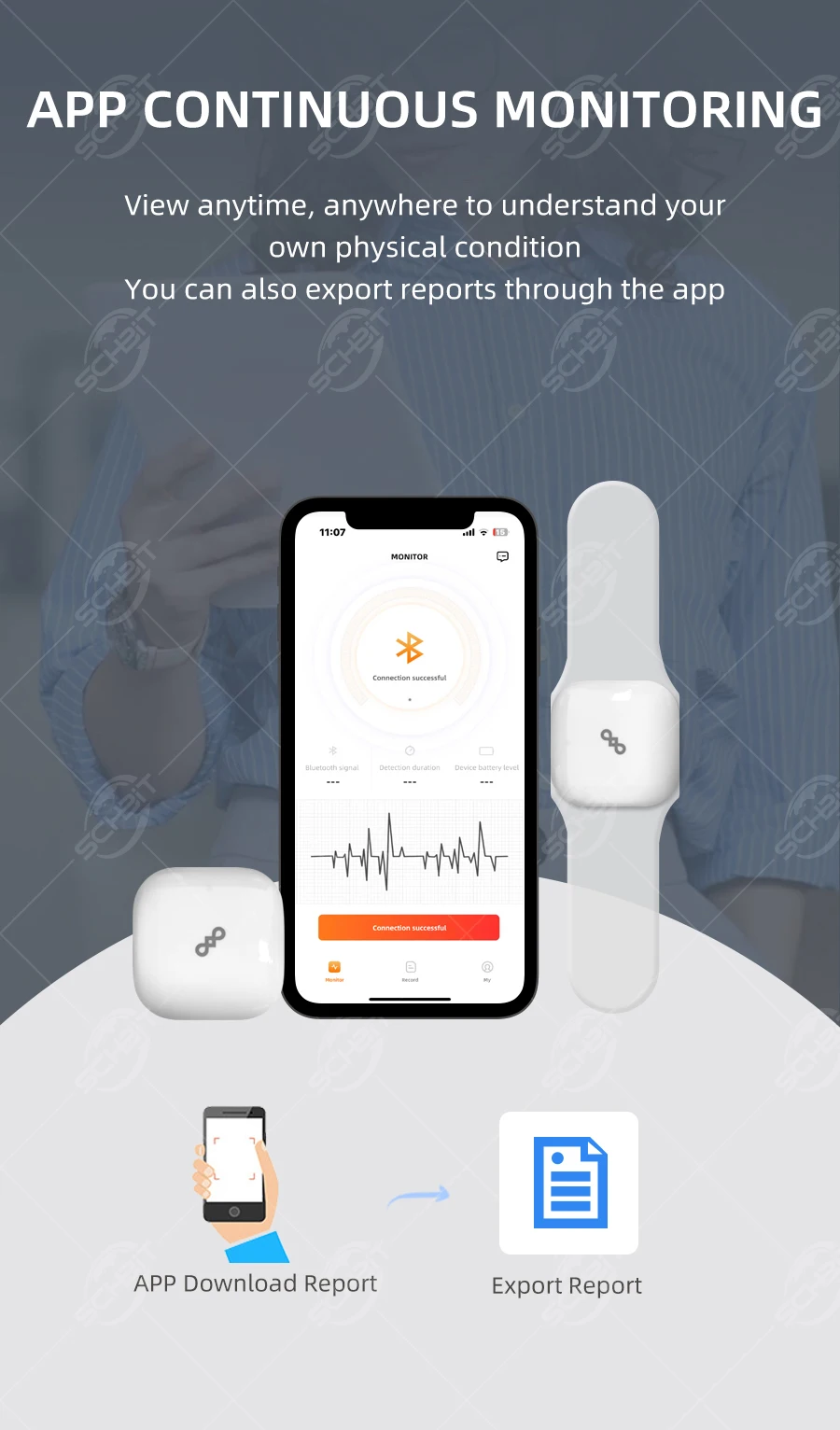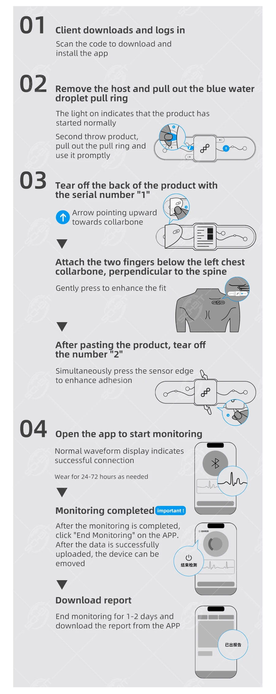 When monitoring is complete, tap "End Monitoring" in the APP. Wait for data upload confirmation before removing the device. This device is for single use only – please discard after removal. The report can be downloaded from the APP within 1–2 days.