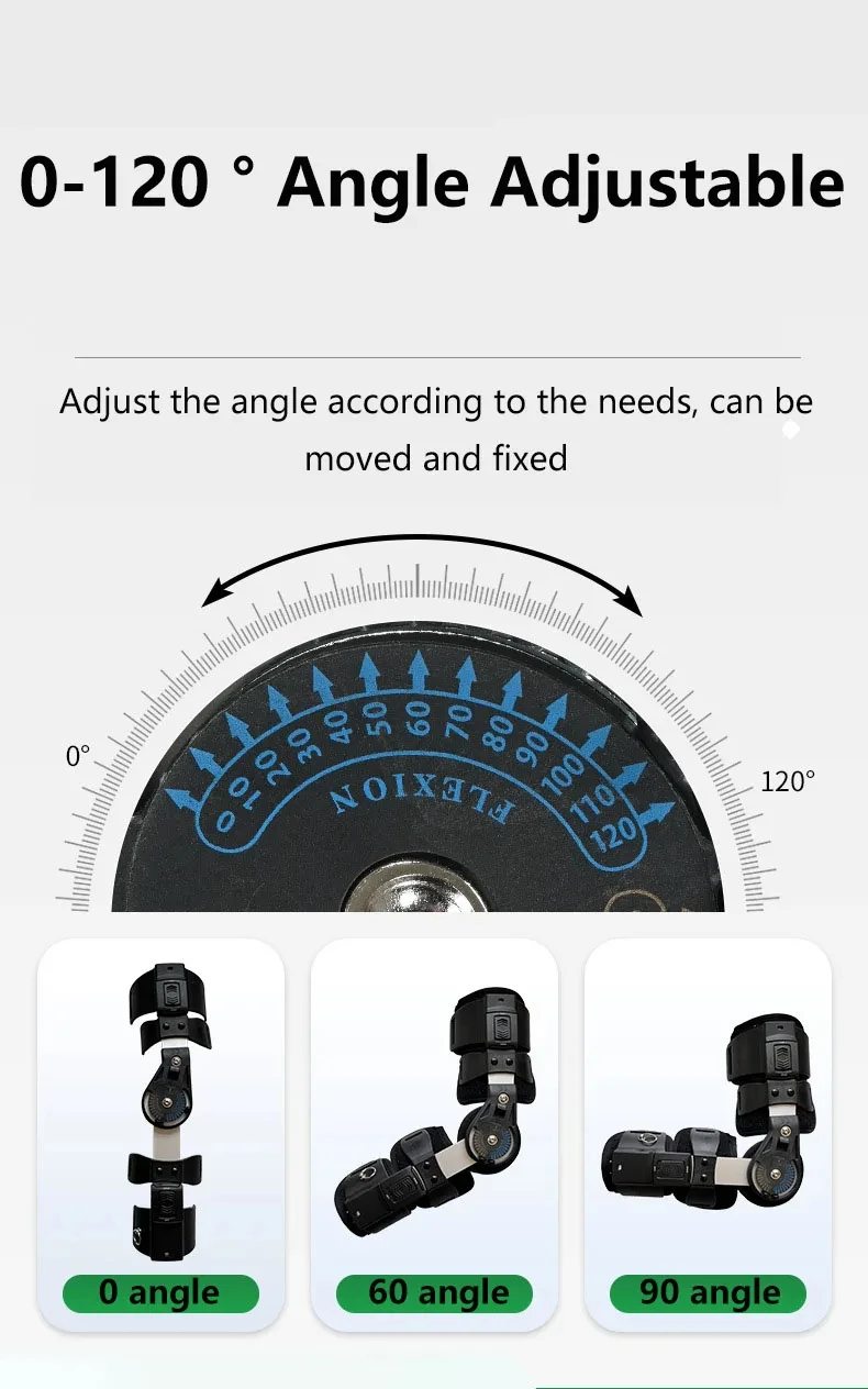 2.Easy to adjust ROM hinge with lock-out capability, Extension limitation at: 0°, 15°, 30°, 45°, 60°, 75°, 90°, Flexion limitation at: 0°, 15°, 30°, 45°, 60°, 75°, 90°, 105°, 120°