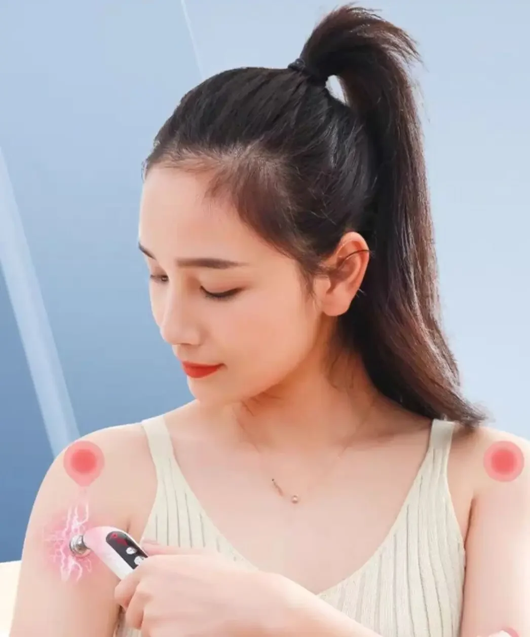 (1) Apply the gel to the body before use . The gel can reach the deep layer of the skin , lock the water , lubricate the skin , and let the five metal heads of round cover , ball , knife , u and bow rest on the skin Slide freely on the for added comfort . When on , press the power key , and the display screen will display " O ". When pressed to 1, the indicator light will flash , indicating that it is working . Then hold the reflux sheet of the pen body and gently contact the probe of the pen with the human skin Slide slowly on the .